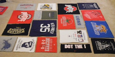 These t-shirt quilts are great for at least two things: preserving memories and making a quilt top without buying all that fabric. And for me they provide a bonus by offering lots of scraps to use to make smaller t-shirts for little boys (or girls, but I don't have any of those).