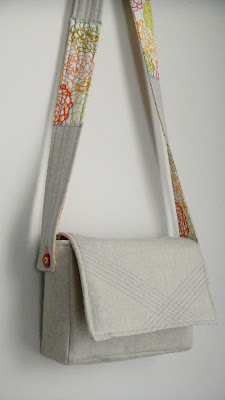 I picked up this linen as a remnant and originally had plans to make a pair of pants for one of the boys. But I've had it in my stash for a while, so I decided to make a new bag for myself instead, you know with spring coming at all. I added some decoration to the front flap for a little interest to a neutral fabric: a few lines of blue straight stitching.